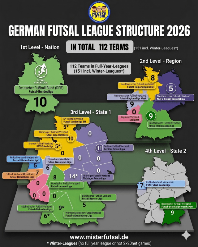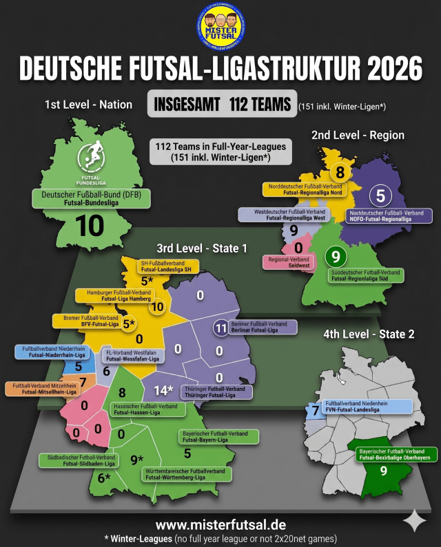 Der Futsal in Deutschland hat in den letzten zehn Jahren eine rasante Entwicklung hingelegt. Von den ersten Schritten der offiziellen Deutschen Futsal-Meisterschaft (die von 2006 bis 2021 als Endrundenturnier ausgetragen wurde) über die Gründung der Deutschen Futsalnationalmannschaft im Jahr 2016 bis hin zur aktuellen Futsal-Bundesliga. Aber wie sieht der Unterbau im Jahr 2026 eigentlich genau […]