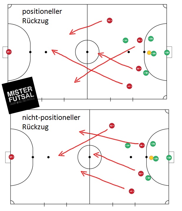 Der Rückzug entspricht als eigene Defensivhandlung der ersten Phase der Verteidigung (Artikel 1). Bei dieser Handlung ziehen sich die Spieler nach einem Ballverlust als Team in die eigene Defensivformation zurück. Der Rückzug ist dann erfolgreich abgeschloßen, sobald sich alle Spieler zwischem dem Tor und der Balllinie positioniert haben.Es wird zwischen dem positionellen und nicht-positionellen Rückzug unterschieden. Beim positionellen Rückzug bewegen sich die Spieler auf ihre vorher festgelegten Positionen zurück. Diese Art des Rückzugs verlangt eine klare Positionsverteilung der Spieler untereinander. Der voher definierte Fixo muss seine Rolle beim Rückzug erneut einnehmen, unabhängig davon, welche Position er gerade auf dem Feld bezieht. Diese Form bietet sich an, wenn ein Spieler eine gewisse Rolle hervorragend oder eben gar nicht beherrscht. Spieler mit schwächen in der Kommunikation werden dadurch zum Beispiel geschützt, die Verantwortung des Fixos als Defensivlenker übernehmen zu müssen. Die weitaus häufigere, und der Geschwindigkeit des Futsals angepasste Art, ist der nicht-positionelle Rückzug. Bei diesem Rückzug nehmen die Spieler entsprechend der Situation die nächstmögliche Position im Abwehrverbund ein. Natürlich sollte ein Mindestmaß an Kommunikation und Spielübersicht bei allen Spieler gegeben sein. Der Vorteil liegt eindeutig in der Geschwindigkeit und Organisation des Rückzugs.