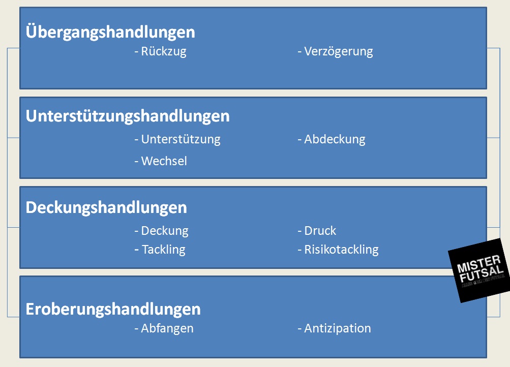 Unter den Übergangshandlungen fallen alle Aktionen, die direkt nach einem Ballverlust der eigenen Mannschaft eintreten. Nach dem Übergang des Ballbesitzes an den Gegner stehen zwei Handlungen im Fokus. Neben dem Rückzug des Teams gilt die taktische Verzögerung als eines der Kernthemen im Futsal.
