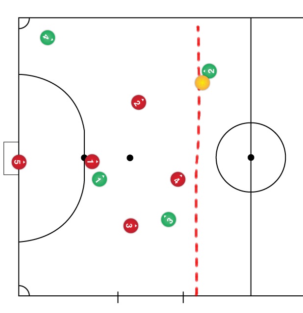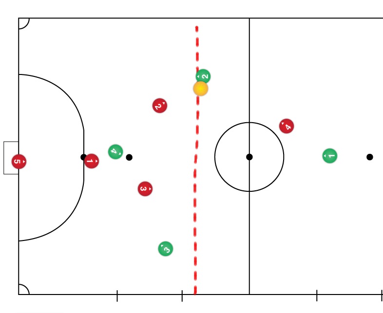 Schauen wir uns die Regeln beispielhaft auf der Taktiktafel an. Team Rot verteidigt, Team Grün greift an. Die erste Regel fordert eine klare Positionierung aller Spieler zwischen dem Ball und dem eigenen Tor. Wir ziehen demnach eine imaginäre Linie am Ball und kontrollieren die Position der Spieler. Und was sehen wir sofort? Spieler 4 ist der ersten Regel nicht nachgekommen. Was bedeutet das nun für die Defensivbemühungen von Rot? Da nicht alle Spieler hinter der Ballinie positioniert sind, gibt die Verteidigung den Vorteil ab, in Überzahl den Angriff zu bremsen. Spieler 4 scheint Spieler 1 von Team Grün zu verteidigen, doch der hat mit den Angriffsbemühungen seiner Mannschaft nichts zu tun. Der Spieler hat in diesem Moment keine Funktion auf dem Feld. Damit schwächt er offenkundig die eigene Mannschaft, die er bei der Defensivarbeit hinter dem Ball unterstützen könnte. Im schlimmsten Fall stört der Spieler das komplette Abwehrsystem, da die Mitspieler nicht mehr die vorgegebene Grundformation einhalten können.