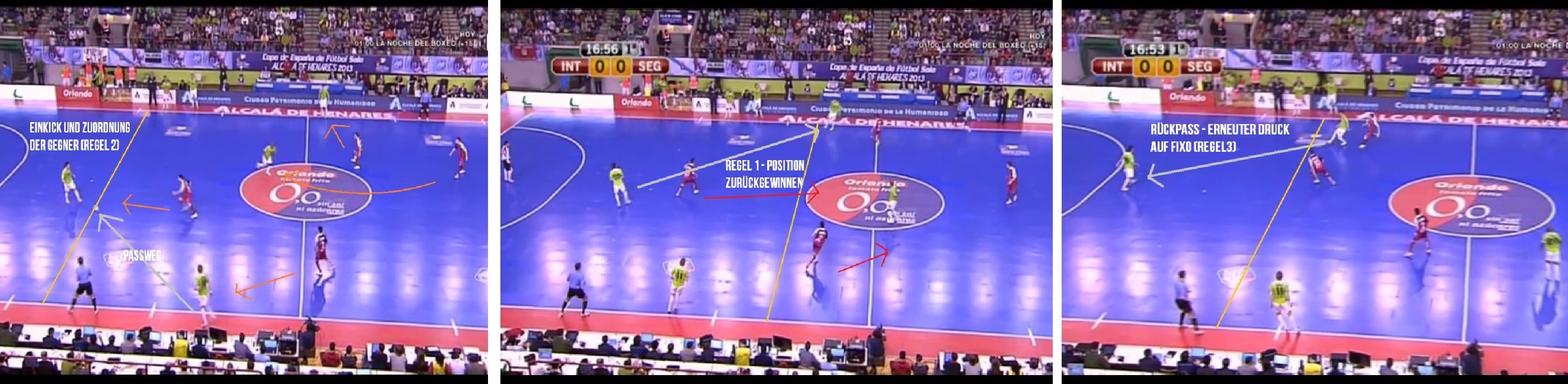 Einige der Regelfragmente sind uns aus den FIFA-Basis-Regeln bekannt, wie der Druck auf den Ball und die Untersützung der Spieler. Die vier Regeln greifen allerdings stärker auf vorhandenes Futsalwissen zurück und setzen direkt einige Defensivhandlungen und Konzepte um. Die Qualität der Defensive kann ausgehend von dem System von Núñez Gago je nach Spielsituation anhand der vier Regeln kontrolliert werden. Setzen die Spieler die Defensivbemühungen ihrer Mannschaft perfekt um, sollten alle Regeln greifen. Vorrangiges Ziel ist der Schutz der Mitte, der als abschließende Regel festgehalten wird. Wie die Regeln auf dem Spielfeld umgesetzt werden, dass haben wir euch in einem kleinen Video zusammengeschnitten.
