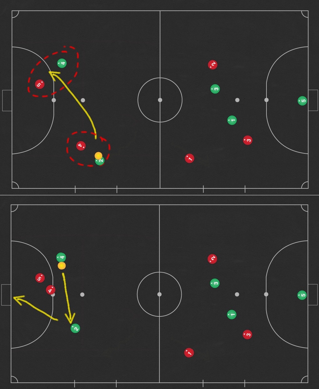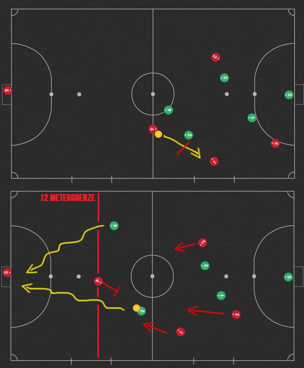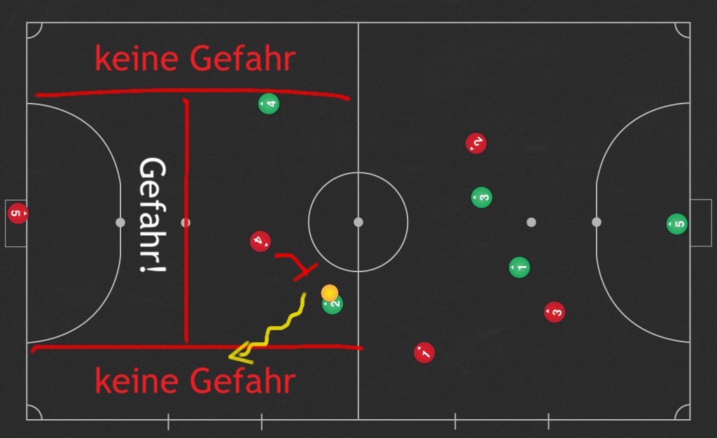 Sollten die Mitspieler noch nicht die Unterzahlsituation ausgeglichen haben, ist es wichtig, die Angreifer in eine ungünstige Position zuleiten. Für die Defensive können wir von „sicheren Zonen“ sprechen, in denen ein Angreifer weniger Schaden anrichten kann, nämlich die jeweiligen Außenbahnen. Dort wird dem Offensivspieler einerseits die Spielbegrenzung ein Hindernis sowie der Winkel für einen Torabschluß ungünstig.