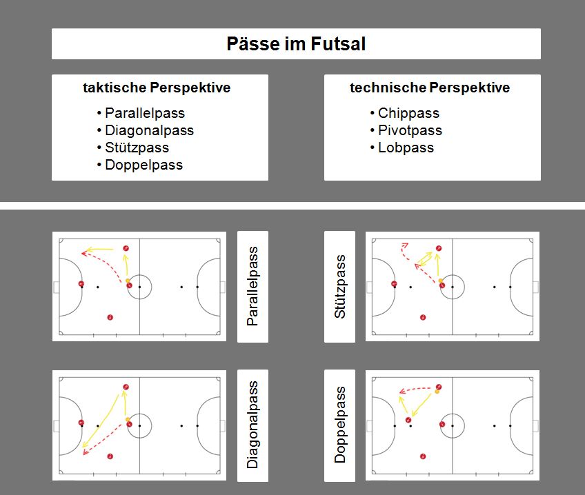 Grundsätzlich können zwei Perspektiven beim Futsalpass unterschieden werden: eine taktische sowie eine technische Perspektive. Bei der taktischen Perspektive wird der Pass auf seine taktische Funktion bezogen. Abhängig von der gespielt Position des Passgebers und dem Passweg haben sich beim Futsal einige typische Bezeichnungen wie la paralela oder la diagonal im spanischen Futsalvokabular durchgesetzt. Wir grenzen vorerst vier Typen ab: Der Parallelpass (la paralela), der Diagonalpass (la diagonal), der Stützpass (Teilkonzept von la cortina) und der Doppelpass (sowohl horizontal als vertikal). Die technische Perspektive hingegen bezeichnet die Technik, mit der ein Pass gespielt werden kann. Auch hier haben sich sehr spezifische Techniken entwickelt, die im Feldfußball seltener Einsatz finden. Zu nennen sind zum Beispiel der der Chippass, der Pivotpass und der Lobpass. In diesem Artikel widmen wir uns einzig der taktischen Perspektive.