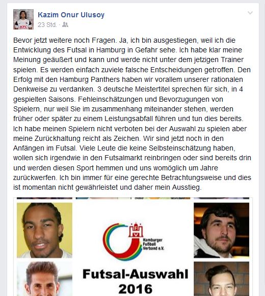 Am Freitag startet das 3. Futsallandesauswahltunier in Duisburg. Über die Jahre haben sich einige Spieler und Trainer bereits einen Namen gemacht, weshalb die Community immer „heiß“ auf die kommenden Teams sind. Gerade die potenziellen Anwärter auf die Nationalmannschaft sind sicherlich sehr interessiert, welche Konkurrenten zusätzlich in das Rennen um die Plätze im Team gehen. Fast alle Favoriten der zwei DFB-Sichtungslehrgänge scheinen auch dieses Jahr aufzulaufen. Mit Timo Heinze (Mittelrhein, Panthers Köln) wird wohl verletzungsbedingt einer der Anwärter auf die Nationalmannschaft fehlen. Bei seinen bekannten Leistungen könnte aber die Nominierung für die DFB-Fünf auch ohne eine Teilnahme möglich sein. Des Weiteren wird mit Onur Ulusoy einer der prägenden Persönlichkeiten der letzten beiden Turnier fehlen. Ulusoy gibt Probleme mit dem Trainerteam seiner Auswahl als Grund an (siehe Facebookpost rechts). Gerade Ulusoy gilt seit langem als einer der Kandidaten für den Sprung in die Nationalmannschaft.