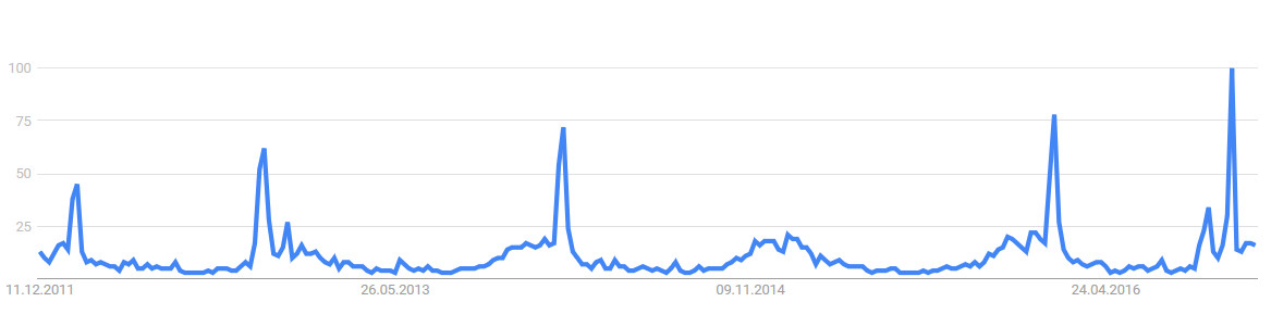 Mit Blick auf die Google-Hits von 2011 bis Dezember 2016 (Abbildung 1) ist der Länderspieleffekt gar nicht so deutlich erkennbar. Neben eines kontinuierlichen Grundinteresses ragen insgesamt fünf größere „Interessenwellen“ heraus. Alle – bis auf den letzten – sind Anfang Februar zu beobachten. Ende Januar war bisher immer das Landesauswahlturnier, welches im Nachgang anscheinend zu einer größeren Aufmerksamkeit führte. Im Kontrast zum Landesauswahleffekt Anfang 2016 (eventuell auch in Verbindung mit der Bekanntgabe der Gründung einer Nationalmannschaft), waren die Anfragen zum Länderspiel gerade einmal 25% höher. Ein Hinweis, das vor allem bereits im Futsal involvierte „Fans“ durch das Länderspiel erreicht wurden. Weiterhin fällt auf, dass im allgemeinem Interesse kein ansteigender Trend zu erkennen ist und seit 2011 annährend konstant geblieben ist.