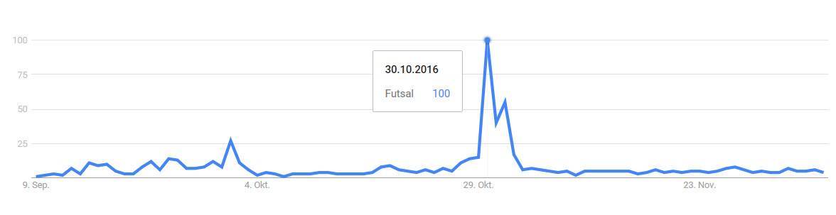 Um den Effekt des Länderspiels genauer zu untersuchen, zeigt Abbildung 2 die Google-Anfragen der letzten 3 Monate. Deutlich ist zu sehen, dass sich das Interesse an Futsal sehr schnell nach dem Länderspiel auf das vorherige Niveau zurück entwickelt hat. Das inszenierte Showevent hatte daher nur einen sehr kurzfristigen Einfluss auf das Futsalinteresse in Deutschland.