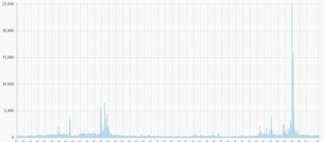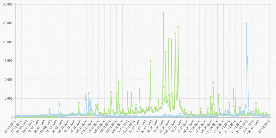 Unabhängig vom herausragendem „Peak“ im November 2016, ist das Bild der Wikipedia-Anfragen nahezu deckungsgleich mit den Google-Anfragen (Abbildung 3). Auch hier ist im Februar der Effekt des Landesauswahlturniers bzw. der Ankündigung einer Nationalmannschaft deutlich sichtbar. Was jedoch sehr unterschiedlich zum Verlauf der Google-Anfragen heraussticht, ist der enorme Effekt des Länderspiels. Am Spieltag besuchten 25.000 Leute die deutsche Wikipedia-Seite. Dass dieser Wert sensationell ist, zeigt Abbildung 4 eindrucksvoll: im Spitzenwert ist das Interesse an Futsal vergleichbar mit den Aufrufen nach „Thomas Müller“ (Grün). Generell schaffen nur sehr wenige Wikipedia-Seiten einen täglichen Aufruf von 5000 – das Event war dementsprechend sehr weitreichend in Deutschland. Es ist anzunehmen, dass doch einige noch nicht Futsalinteressierte erreicht wurden (wer sucht schon Futsal, wenn er schon im Futsal involviert ist).  Leider zeigen die Wikipediadaten auch, dass nach dem Länderspiel (Abbildung 3) keine nachhaltigen Effekte bzw. nachhaltiges Interesse zu erkennen sind. Das Interesse ging schneller als es kam.