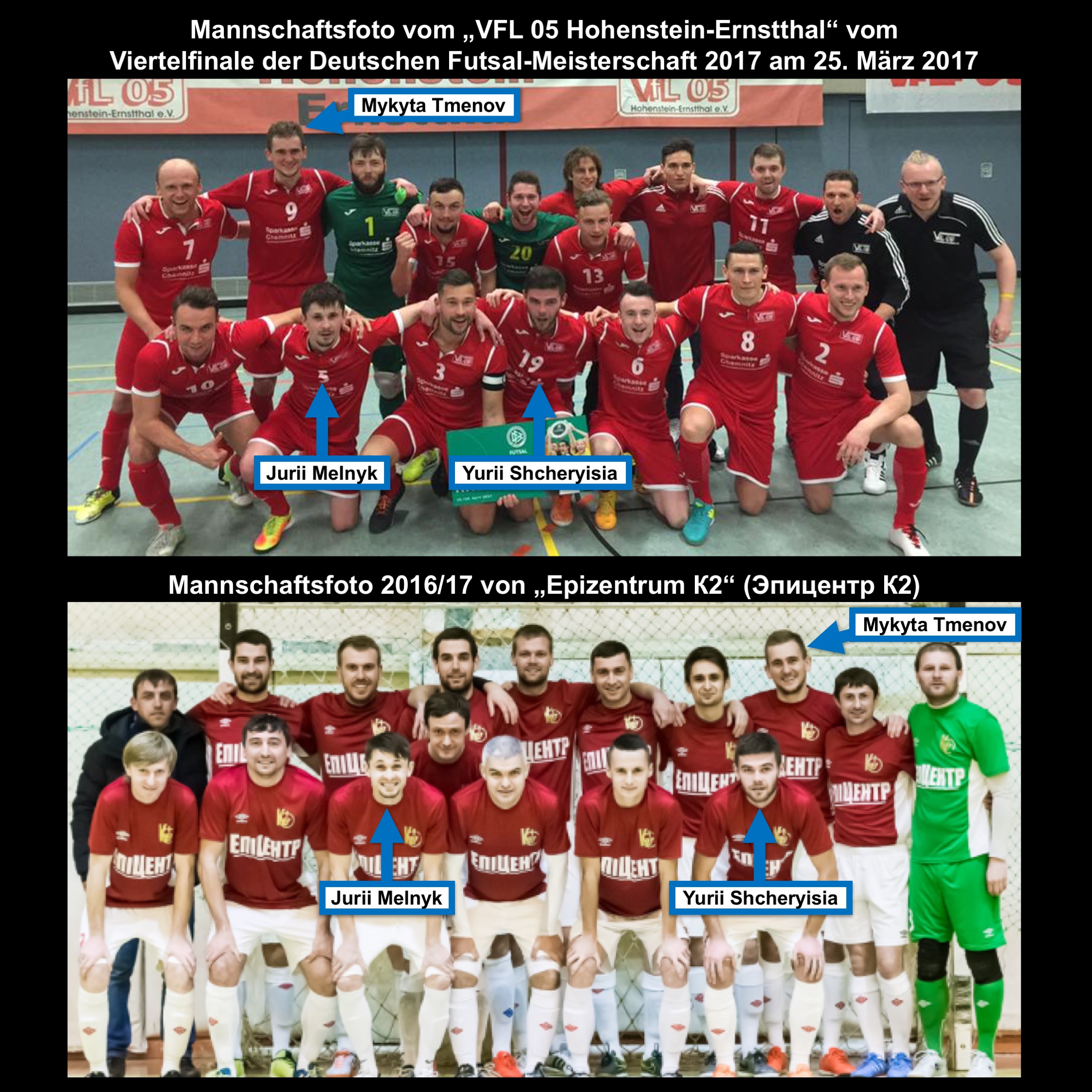Demnach spielen die eingesetzten Hohensteiner Viertelfinalspieler Mykyta Tmenov (ukrainisch/kyrillisch: Никита Тменов), Yurii Shcheryisia (ukrainisch/kyrillisch: Юрий Щерица) sowie Jurii Melnyk (ukrainisch/kyrillisch: Юрий Мельник)  aktuell (Spielberichtsbogen vom 11. März 2017) nachweislich im ukrainischen Futsal in der Superliga KFL 2016/17 des Kiewer Verbandes bei der Mannschaft „Epizentrum К2“ (Эпицентр К2). Ferner gibt es Video-Highlights vom letzten Spiel am 11. März 2017 gegen Chumazkij Schljah-Academica (ЧША), in dem Tmenov, Shcherysia und Melnyk  zu erkennen sind. Zudem wird parallel zum Viertelfinale der Deutschen Futsal-Meisterschaft 2017 in einem Spielbericht zum letzten Spieltag der ukrainischen Superliga KFL am 25. März 2017 in Bezug auf den Tabellenführer und neuen Meister „Epizentrum К2“ (Эпицентр К2) darauf hingewiesen, dass sich deren wichtigsten Stammspieler an diesem Spieltag auf „Reisen“ befanden, doch konnte man sich aufgrund des Punktvorsprungs von 4 Punkten am letzten Spieltag gegen den Zweiten der Liga eine Niederlage erlauben. Die hier gemeinten „reisenden“ Stammspieler (Tmenov, Melnyk und Shcheryisia) haben als „eingespielter Block“ am 25. März 2017 im Dress des VFL 05 Hohenstein-Ernstthal gegen den MCH Futsal Club Sennestadt im Viertelfinale der deutschen Futsal-Meisterschaft 2017 gespielt.