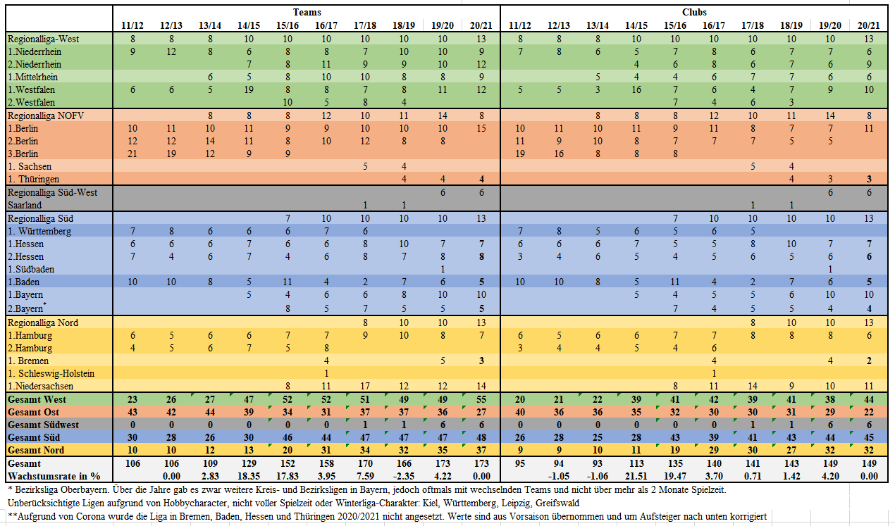 Wie in obenstehender Grafik ersichtlich, stagniert das Team- und Club-Wachstum in Deutschland zu aktuellen Saison mit einem Nullwachstum von 0%. Aktuell sind wir weit entfernt von besseren Zeiten wie in 2014 bis 2016, als vermehrt neue Teams in Westfalen, Baden und Niedersachsen entstanden. Auch wenn ein „Nullwachstum“ in Corona-Zeiten zunächst nicht besorgniserregend klingt, so ist eines zu berücksichtigen: die Ligen in Hessen, Bremen, Thüringen und Baden wurden zur aktuellen Saison nicht geplant, weshalb wir an dieser Stelle nur die Werte aus der letzten Saison (abzüglich der Aufsteiger in einer der fünf Regionalligen) übernommen haben. Es besteht daher Unsicherheit in Bezug auf die Anzahl der Teams in diesen Ligen. Gerade in Bremen und Thüringen wäre ein Spielbetrieb unwahrscheinlich gewesen. Ferner ist nicht klar, wie viele Teams sich seit dem Lockdown im November nun eigentlich schon schleichend aufgelöst haben bzw. den Spielbetrieb nicht mehr aufnehmen werden. Aufgrund der Gleichentwicklung von Teams und Clubs gibt es dieses Jahr keine weiteren Konzentrationstendenzen auf größere Teams mit Zwei- und Drittvertretungen.