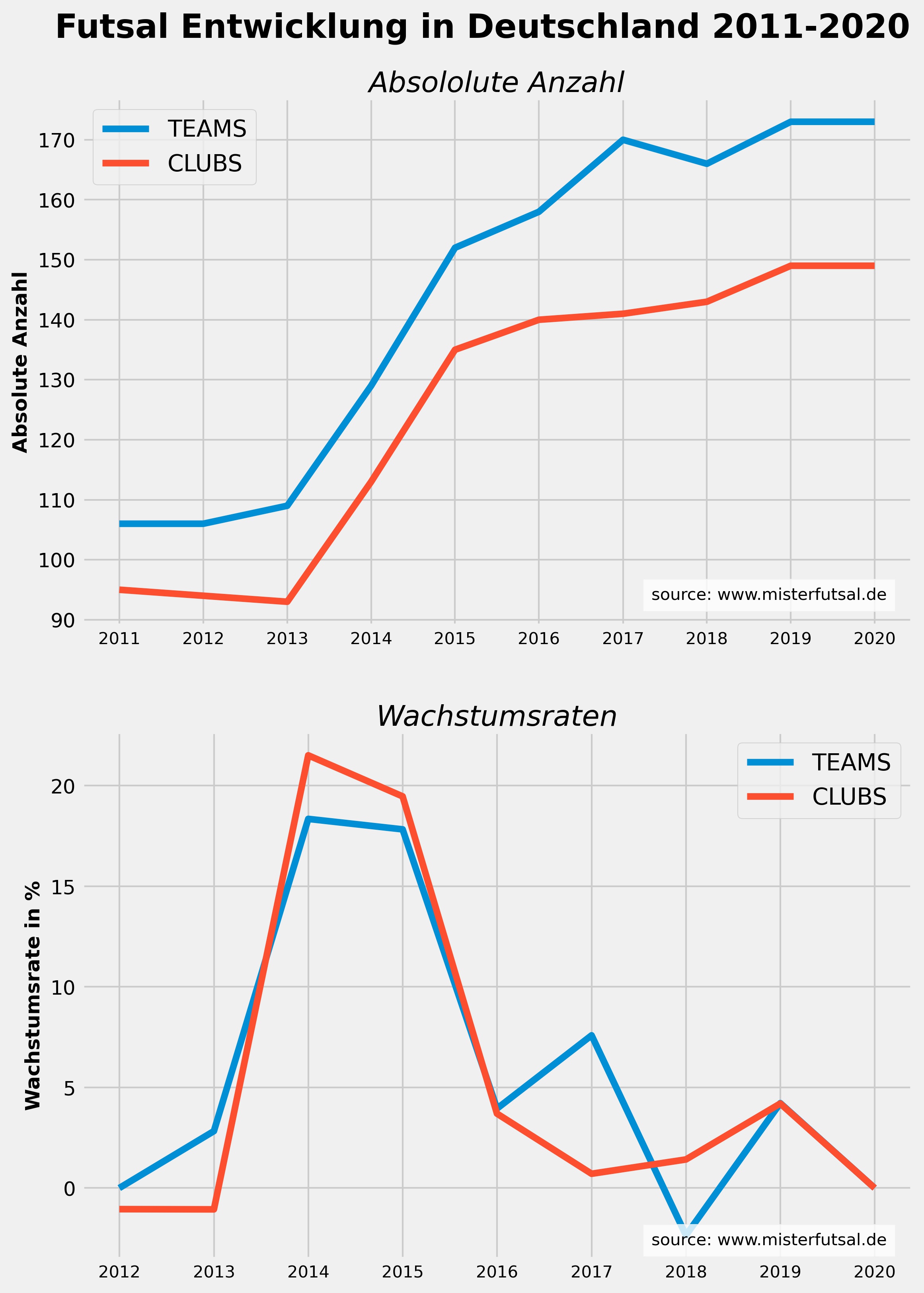 Ungeachtet der beiden aktuellen Trends im Futsal wäre ein positiver Schub für den deutschen Futsal enorm wichtig, wenn wir uns die Entwicklung der Futsal-Teams und Futsal-Clubs in Deutschland anschauen (siehe auch Entwicklungsbericht 2020). Dabei haben wir alle deutschen Futsal-Teams und Futsal-Clubs (keine Zwei- oder Drittvertretung) über fussball.de zusammengesucht, welche für einen regelmäßigen Spielbetrieb 2020/2021 angemeldet waren. Hobbyligen wie in Kiel oder Greifswald sind daher genauso unberücksichtigt, wie einige „Winterligen“, welche nicht über 2x20netto spielen noch weniger als 3 Monate Spielbetrieb anbieten. Die Daten wurden zudem um bereits zurückgezogene Teams (stand Anfang Februar 2021) korrigiert.