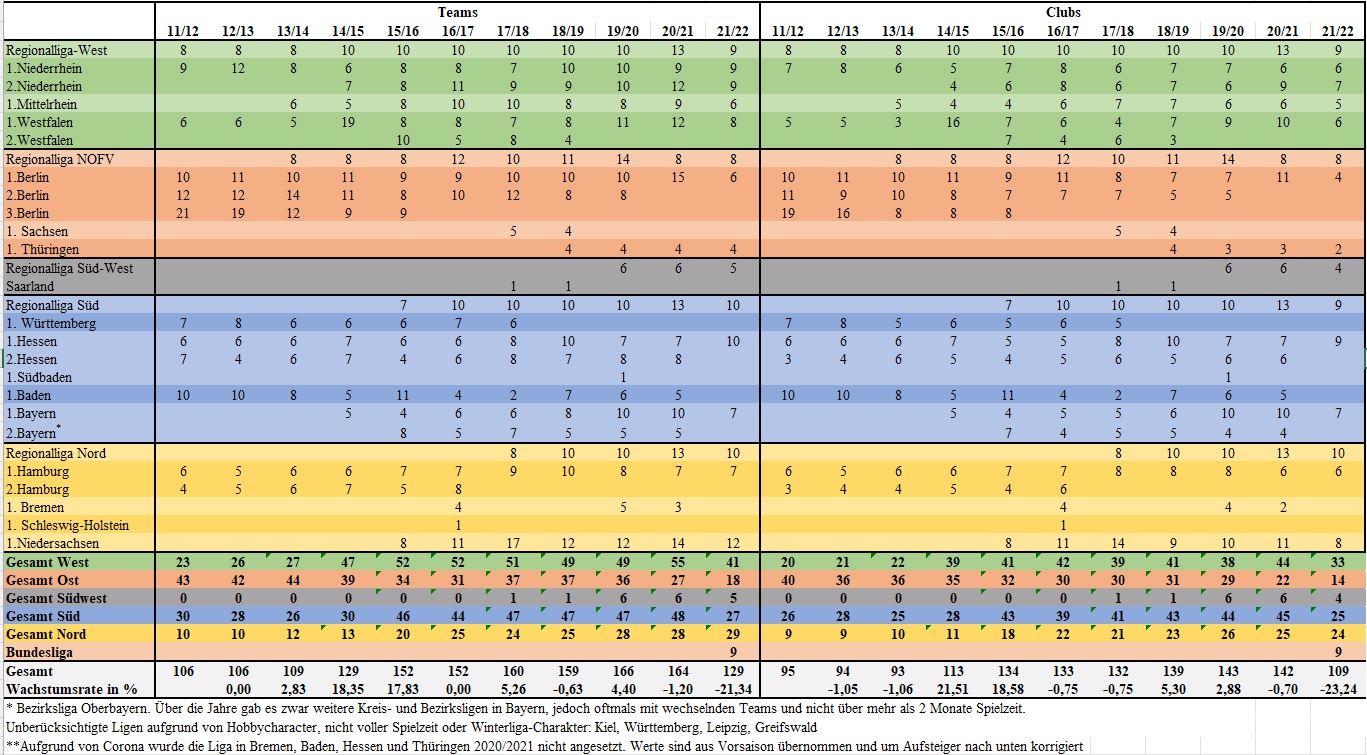 Vor allem die Ligen in Hessen und Niedersachsen hatten mit großen Widerständen in den Landesverbänden zu kämpfen, was zur weiteren Zurückhaltung bei Teams beigetragen hat. Die meisten Futsal-Teams gibt es auch dieses Jahr wieder in der Region West. Mit blick auf die Landesverbände, beherbergt der Fußballverband Niederrhein die meisten Futsal-Teams und Clubs.
