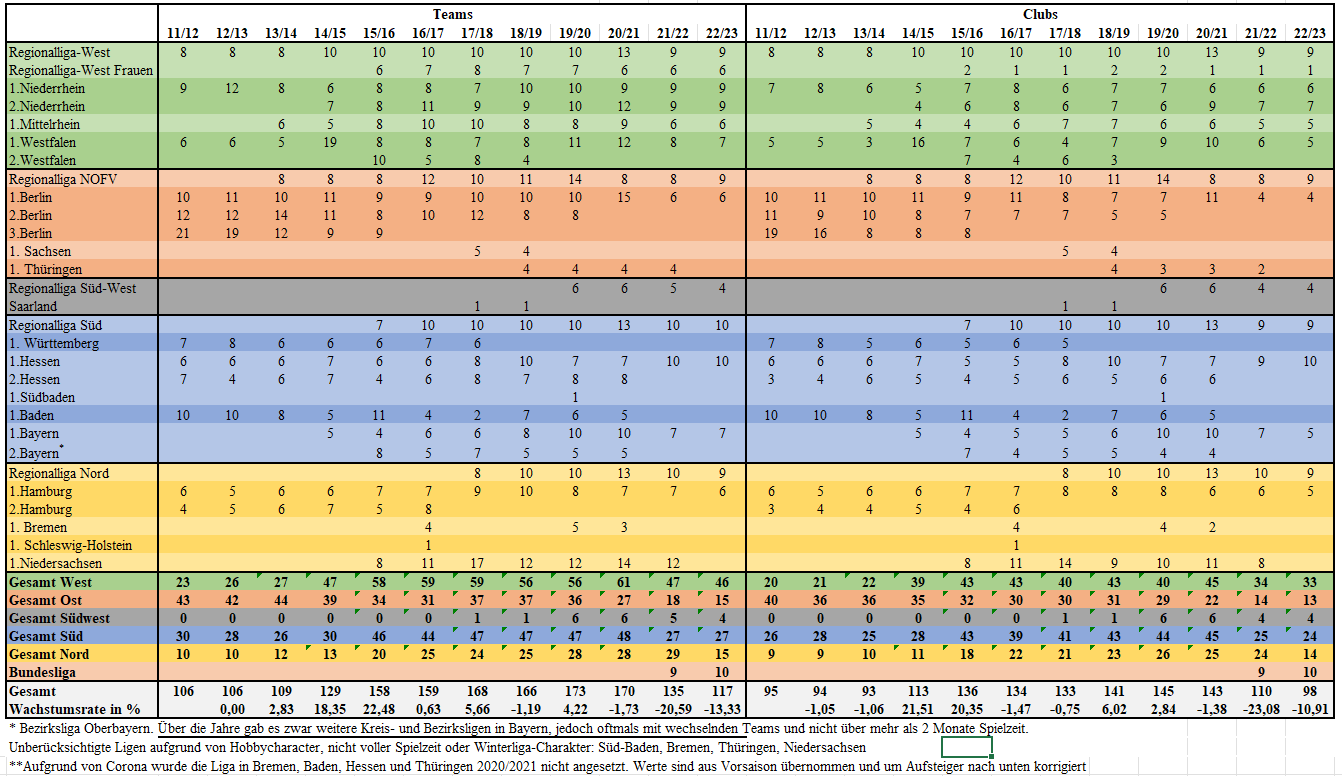 Wir haben uns wie jedes Jahr die quantitative Entwicklung von Futsal-Teams und -Clubs in Deutschland genauer angesehen. Dabei haben wir nur Teams und Clubs gezählt, die im Ganzjahres-Spielbetrieb (mehr als 3 Monate) des DFB aktiv sind und eine Netto-Spielzeit von 20 mal 20 Minuten haben. Hobby- oder Winterligen, wie Bremen, Niedersachsen, Südbaden oder Thüringen, wurden nicht berücksichtigt. Wir haben dabei erstmals die Frauen-Regionalliga-West in die Berechnung einbezogen, die seit 2015/2016 existiert.